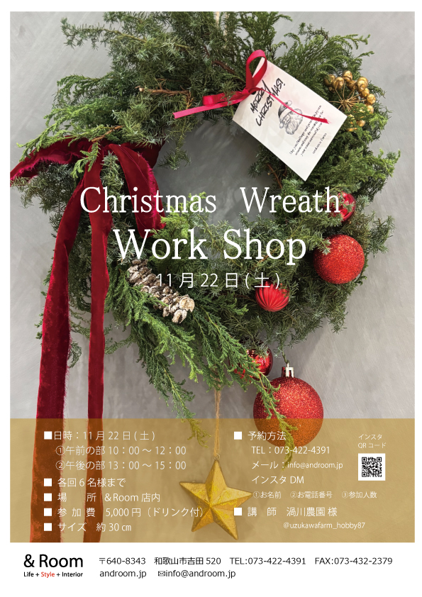 毎年ご好評いただいている『クリスマスリースワークショップ』を11/22(土)に開催いたします。