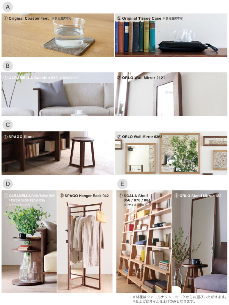 - HIRASHIMAの家具を10万円(税別)以上ご注文いただいた方に選べるプレゼントをご用意。