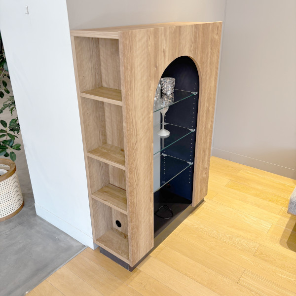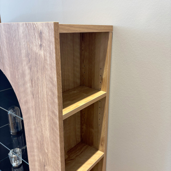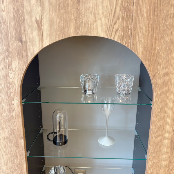 置くだけで様になるサイドボード(シェルフ)まるで暖炉のようなデザインでオープン部分はガラス棚になっており、インテリアライトを灯すと光がガラスを透過してふんわりと広がり、空間がより美しく華やかになります。飾り棚として映えること間違いなし。両サイドにも収納があり、ティッシュやお掃除グッズなどリビング出しっぱなしにしたくはないけどサッと取り出したいモノの収納に便利です。