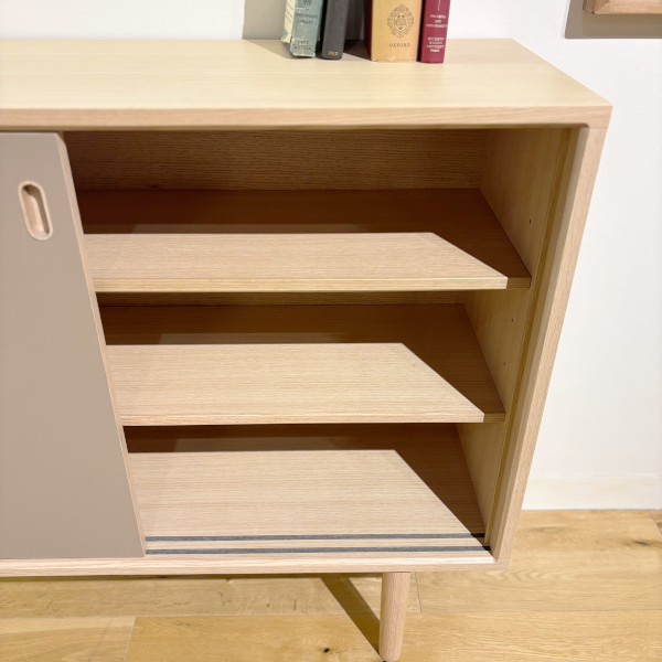コンパクトな引戸サイドボード、扉はメラミン化粧板で4種類からお選びいただけます。サイズはW1200㎜と900㎜の2サイズ、脚元がスッキリしているデザインなのでリビング一角に置いても重く感じません。