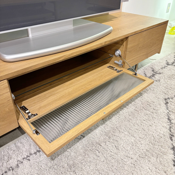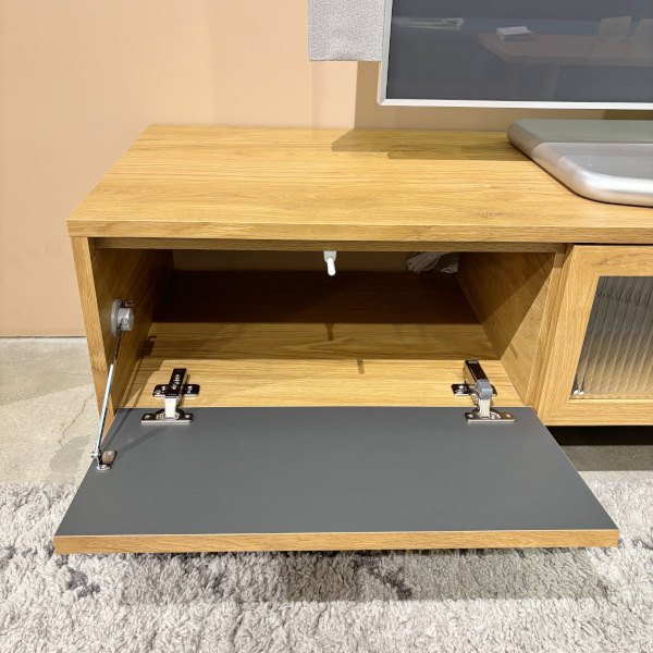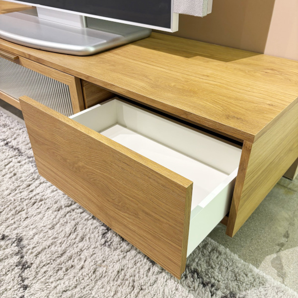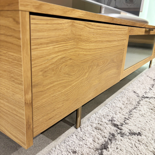 ナチュラルなインテリアに馴染む木目柄で統一されたデザイン。細部までこだわったカラーリングで。ナチュラルなインテリアに自然に溶け込みます。優しい色合いが空間全体に調和し、温かみんおある雰囲気を作り出します。AV機器収納部のフラップ扉部分にはナチュラルなデザインに馴染むモールガラスを採用。適度な透過性で抜け型がありながら、収納しているものが見えにくくプライバシーにも保たれます。ヴィンテージゴールドの取手がアクセントになっています。